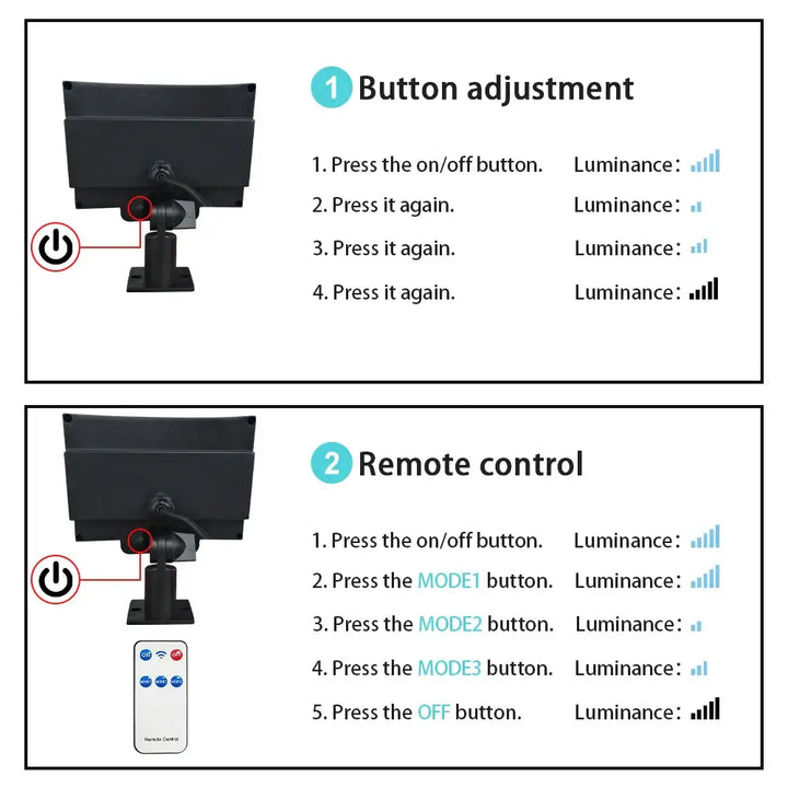 The solar light comes with three distinct lighting modes, which can be controlled using the button switch. Press the button to cycle through the following modes:-